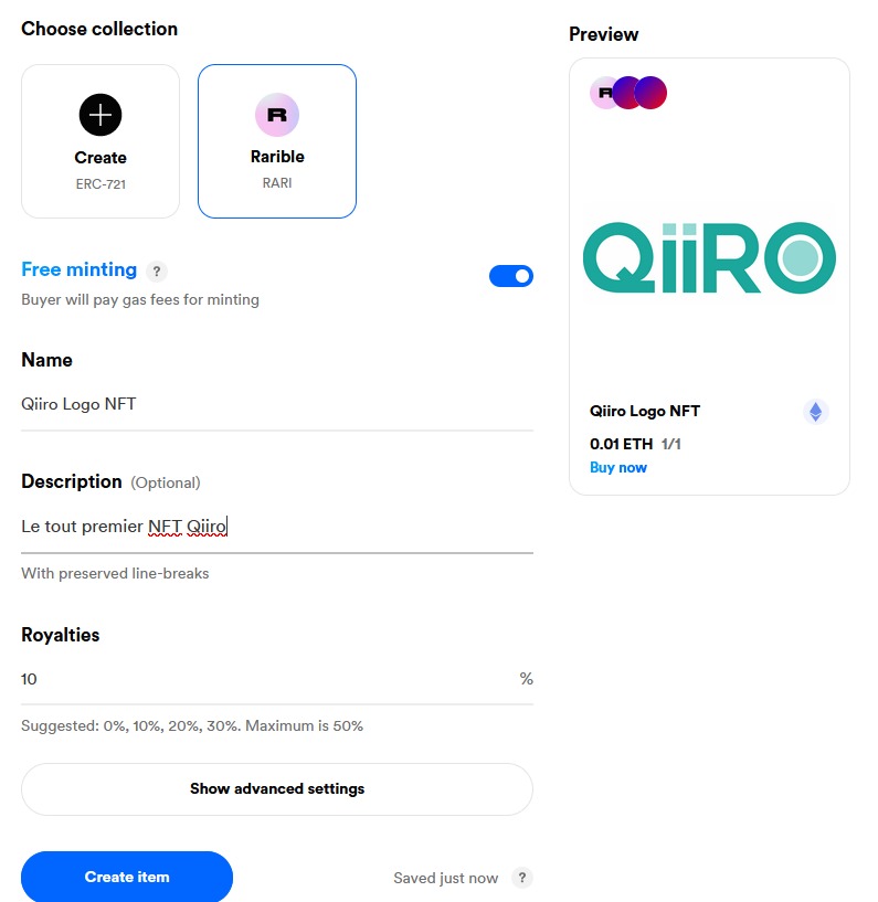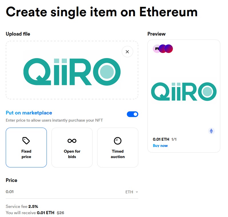 Après avoir choisi le type de NFT (unique ou collection) que vous souhaitez minter, il vous faudra télécharger votre fichier sur Rarible. Vous devez également fixer le prix auquel vous souhaitez vendre votre NFT. Dans cet exemple, nous décidons de vendre le NFT “QiiRO” au prix de 0.01 ETH (soit environ 26$ selon le prix de l’ETH au jour de création du NFT).