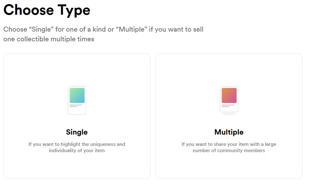 Vous devez ensuite choisir le type de NFT que vous souhaitez créer, c’est-à-dire si vous souhaitez créer un NFT unique, ou si vous voulez commencer à créer une collection de plusieurs NFT. Dans cet exemple, nous choisissons de créer un NFT unique.